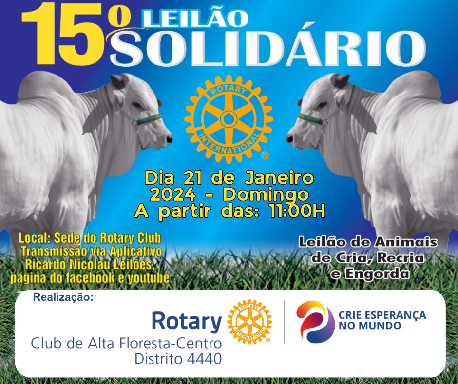 Vem ai o 15º Leilão Solidário promovido pelo Rotary Club de Alta Floresta-Centro, não fique de fora seja um apoiador doando ou arrematando no dia do evento.