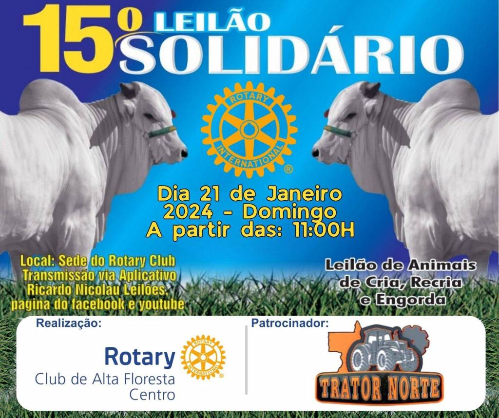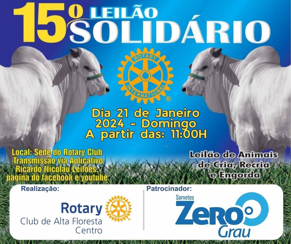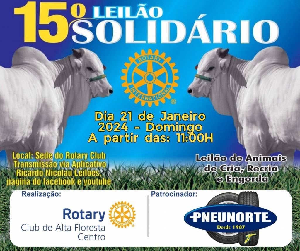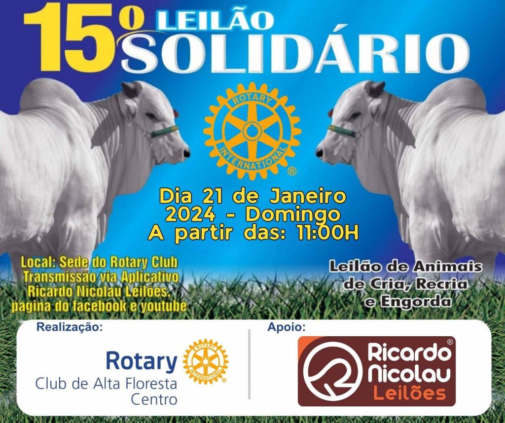 Será realizado no domingo (21), a partir das 11 horas da manhã, na sede do Rotary, a 15ª Edição do Leilão Solidário, realizado pelo Rotary Club de Alta Floresta Centro. O evento tem por objetivo arrecadar recursos para a manutenção de projetos já desenvolvidos, como banco ortopédico, auxílio ao Projeto Cuida Bem de Mim, Lar dos Idosos, CEEDA e entre outros. De acordo com a organização, serão leiloados mais de 200 animais de cria, recria e engorda, oriundos de doações da comunidade rural de Alta Floresta, além de diversas doações do comércio local. O 15º Leilão Solidário terá transmissão pelo aplicativo Ricardo Nicolau Leilões, Facebook e Youtube.