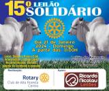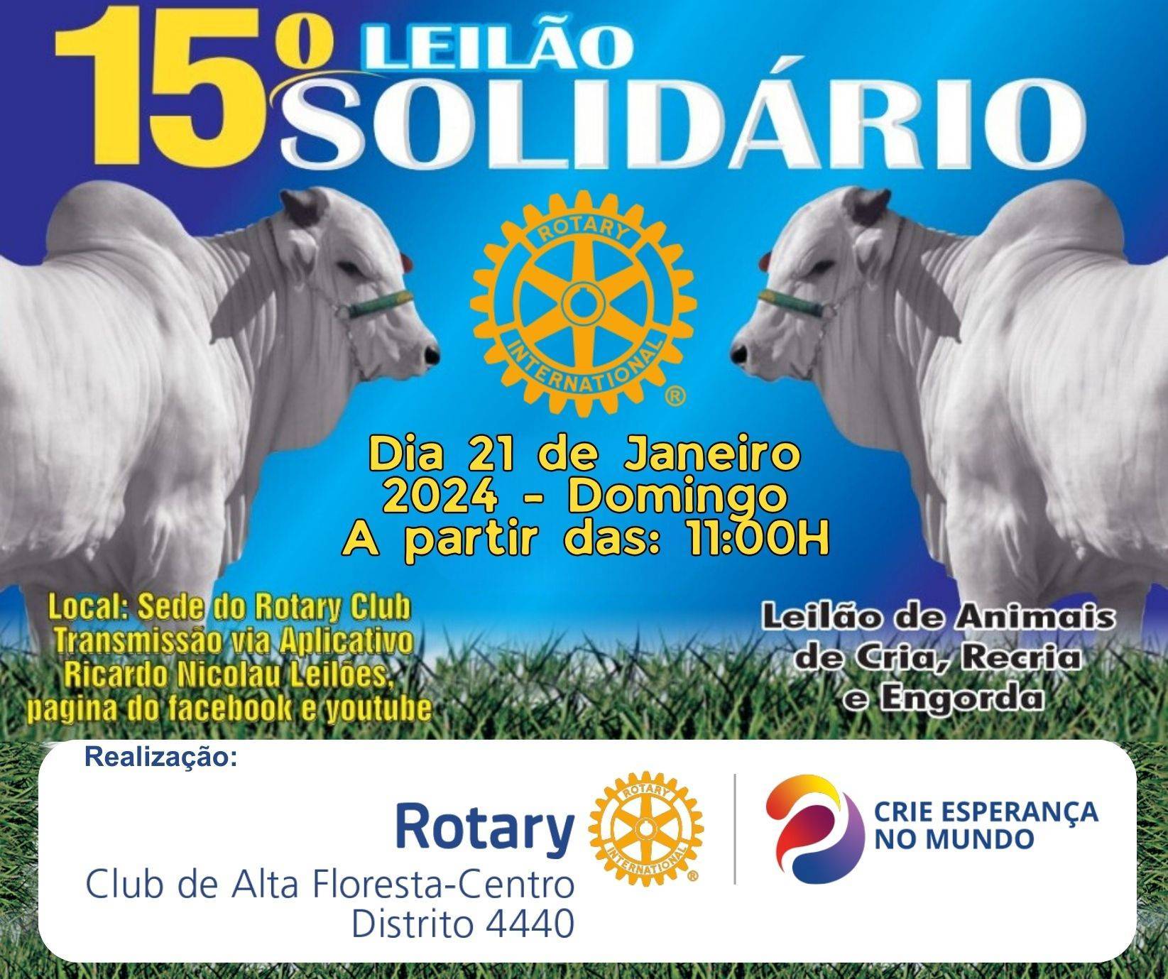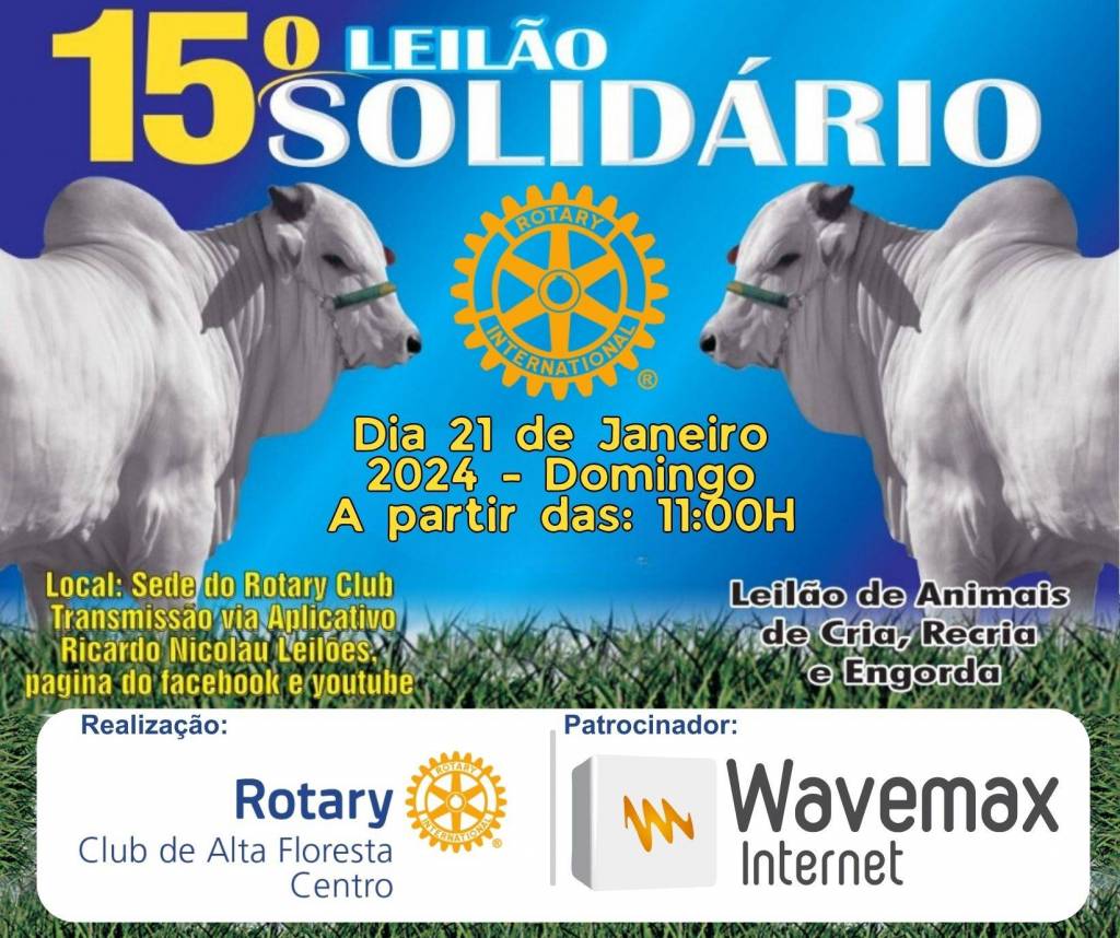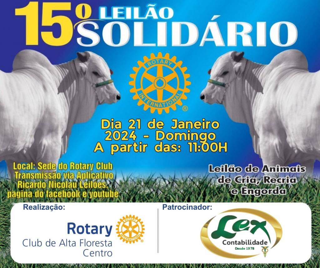 Será realizado no domingo (21), a partir das 11 horas da manhã, na sede do Rotary, a 15ª Edição do Leilão Solidário, realizado pelo Rotary Club de Alta Floresta Centro. O evento tem por objetivo arrecadar recursos para a manutenção de projetos já desenvolvidos, como banco ortopédico, auxílio ao Projeto Cuida Bem de Mim, Lar dos Idosos, CEEDA e entre outros. De acordo com a organização, serão leiloados mais de 200 animais de cria, recria e engorda, oriundos de doações da comunidade rural de Alta Floresta, além de diversas doações do comércio local. O 15º Leilão Solidário terá transmissão pelo aplicativo Ricardo Nicolau Leilões, Facebook e Youtube.