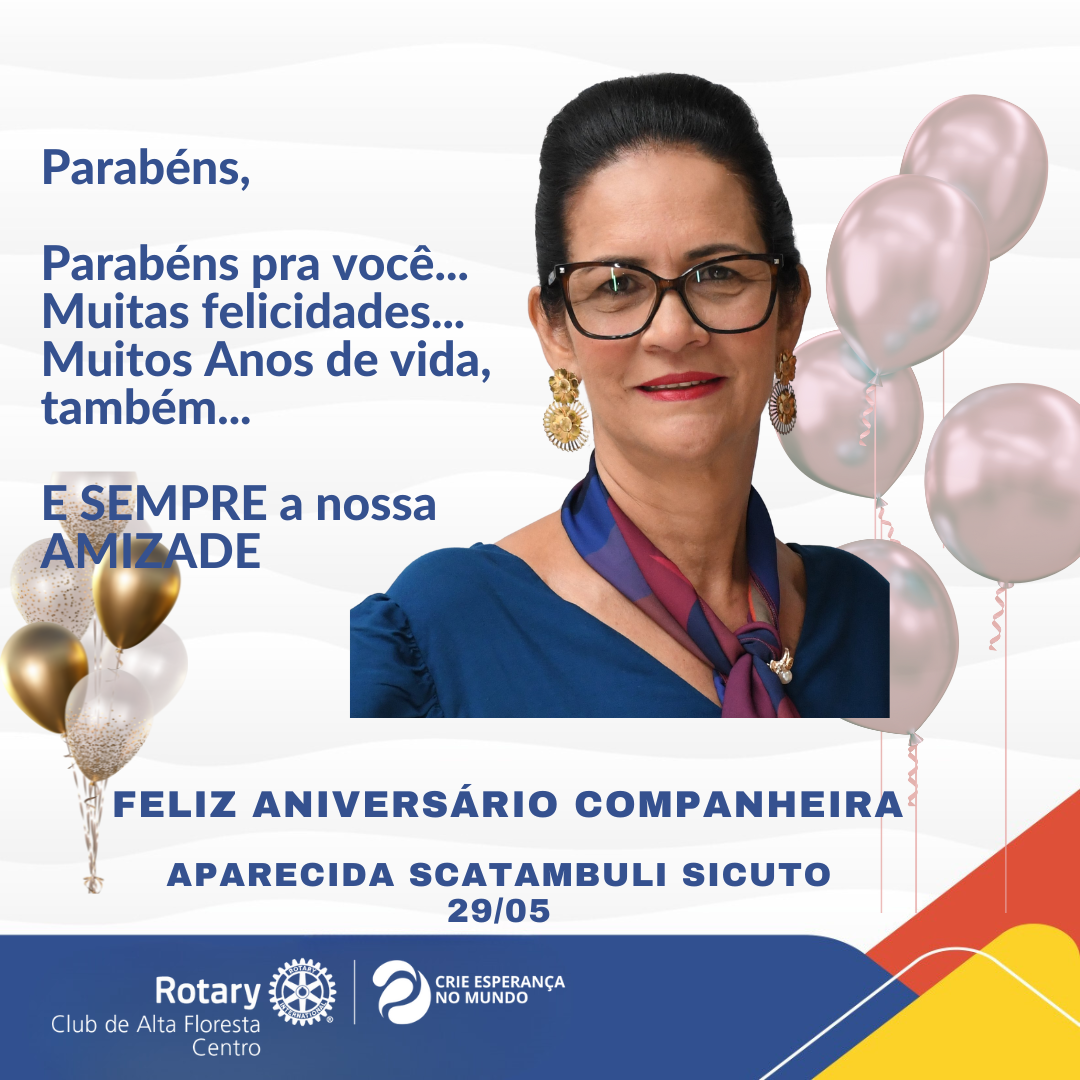 Feliz Aniversário, Companheira Cida Sicuto! Neste dia tão especial, celebramos a vida e a trajetória do nossa estimada companheira Cida Sicuto. Que a alegria e a felicidade sejam constantes em sua jornada, iluminando cada passo com a força da amizade e da companheirismo rotário. Desejamos a você, Cida, um aniversário repleto de realizações, saúde, paz e sucesso em todos os seus projetos. Que a chama do Rotary continue acesa em seu coração, guiando-o na construção de um mundo melhor. Agradecemos imensamente a sua dedicação e contribuição para o Rotary Club de Alta Floresta Centro. Sua presença inspira e motiva a todos nós a buscarmos sempre o bem comum. Parabéns, companheira! Que este novo ciclo seja marcado por momentos inesquecíveis, bênçãos abundantes e a realização dos seus mais belos sonhos. Junte-se a nós e faça a diferença! Somos o Rotary! Somos Pessoas em Ação !