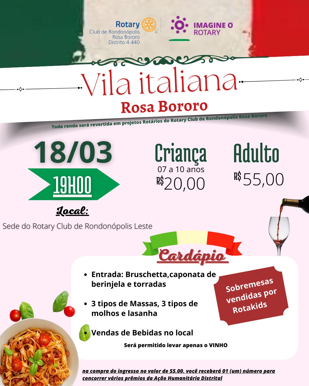 Será permitido levar apenas vinho, outras bebidas serão vendidas no local. Deliciosas sobremesas serão vendidas pelo Rotakids.
